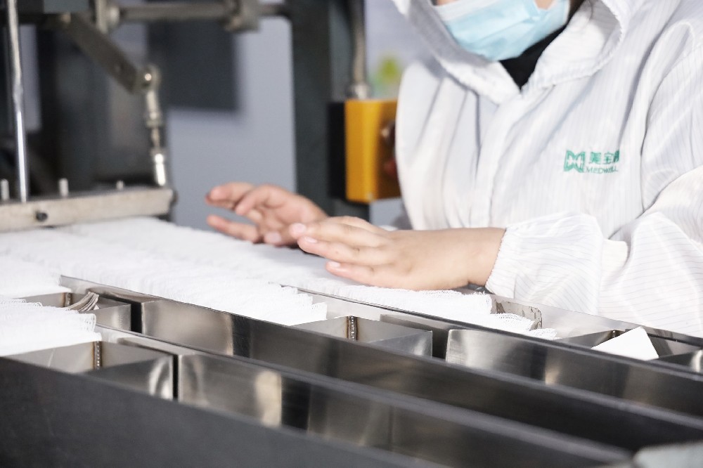 机折车间是专门生产医用纱布片的车间,产品分为消毒与不消毒两大类,产品规格种类齐全,产品有折边与不折边,各工序产线完整,配有蒸汽灭菌柜,从脱脂纱布分切到产品成型、包装针检等,有各类机折设备100余台(美式折叠机与高速机)。